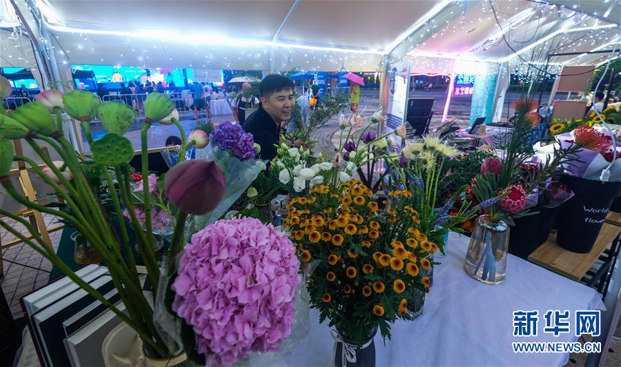 7月10日,工作人員在嘉年華現(xiàn)場(chǎng)插花攤位忙碌。新華社記者徐昱攝。