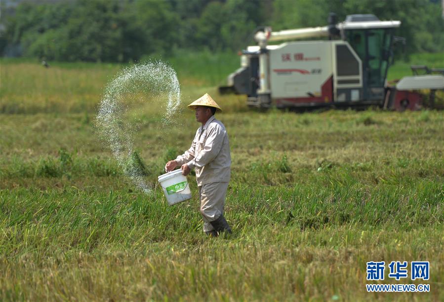 7月11日,村民在湖南省衡陽(yáng)市衡陽(yáng)縣臺(tái)源鎮(zhèn)臺(tái)九村收割后的稻田施肥,為種植晚稻做準(zhǔn)備。近日,湖南各地農(nóng)村陸續(xù)進(jìn)入“雙搶”季,農(nóng)民緊抓農(nóng)時(shí),搶收搶種,力爭(zhēng)糧食穩(wěn)產(chǎn)豐收。新華社記者趙眾志攝