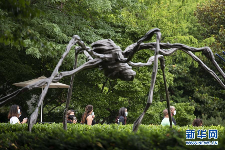 7月11日,在美國華盛頓,人們戴著口罩在國家藝術(shù)畫廊雕塑公園游覽。新華社記者劉杰攝