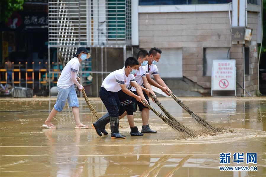 7月12日,融水苗族自治縣文化體育廣電和旅游局清淤小分隊在蘆笙廣場清理地面。當日,在廣西柳州市融水苗族自治縣,融江洪水退去,當?shù)叵嚓P(guān)部門組織多支清淤排險小分隊,積極開展災(zāi)后恢復工作。新華社記者 黃孝邦 攝