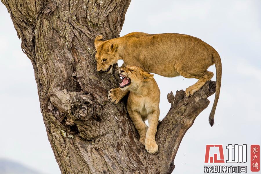 2020年7月13日?qǐng)?bào)道(具體拍攝時(shí)間不詳),Sandesh Kadur是一名印度野生動(dòng)物攝影師,他在坦桑尼亞塞倫蓋蒂國(guó)家公園拍攝到一系列“獅子上樹(shù)”的精彩照片。畫面中,有一只憤怒的母獅為了捍衛(wèi)自己在樹(shù)上的位置,一邊劈叉一邊對(duì)著鏡頭咆哮,有兩只獅子為了爭(zhēng)奪位置互相攻擊,還有一只獅子在找到舒適的位置后呼呼大睡。