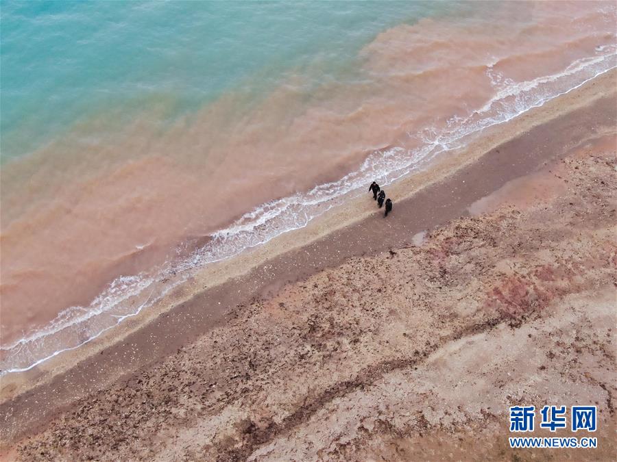 在可可西里索南達杰保護站管護區(qū)域內(nèi)的湖泊附近,龍周才加(中)與隊友才仁多杰(左)、王文豪在巡視(6月30日攝,無人機照片)。新華社記者 張龍 攝