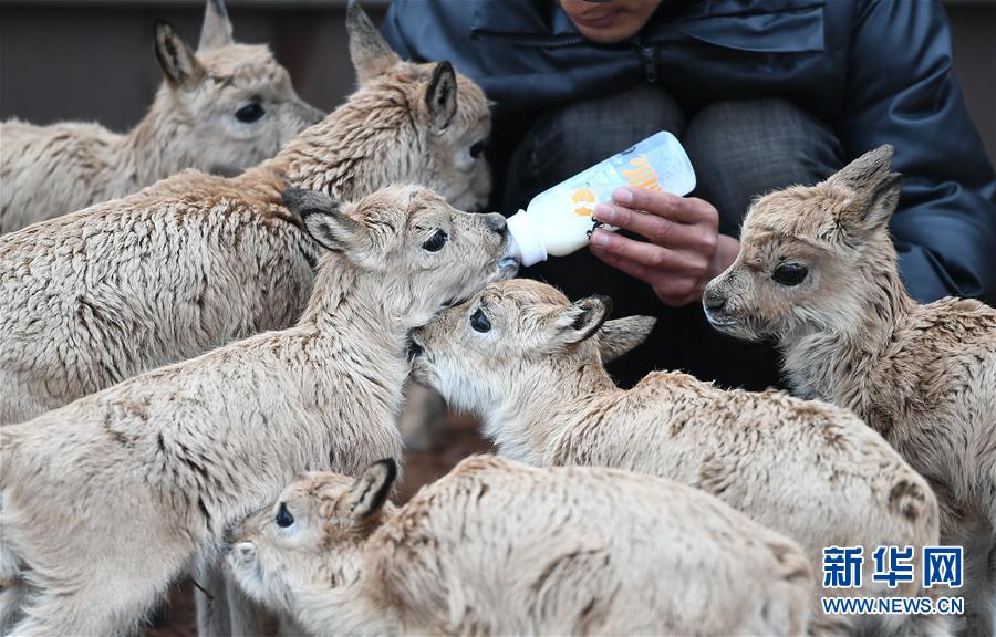 7月7日,三江源國(guó)家公園管理局長(zhǎng)江源園區(qū)可可西里管理處卓乃湖保護(hù)站的工作人員才文多杰在給藏羚羊幼仔喂奶。新華社記者 薛玉斌 攝