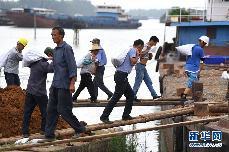 7月14日,當(dāng)?shù)卮迕裢簧习徇\(yùn)砂石袋。近日,受洪水影響,安徽省望江縣華陽鎮(zhèn)境內(nèi)的江調(diào)圩內(nèi)部道路漫水,搶險車輛無法進(jìn)入。當(dāng)?shù)胤姥床块T組織船只裝載砂石袋等防汛物資,運(yùn)往圩堤保防汛。新華社記者 劉軍喜 攝