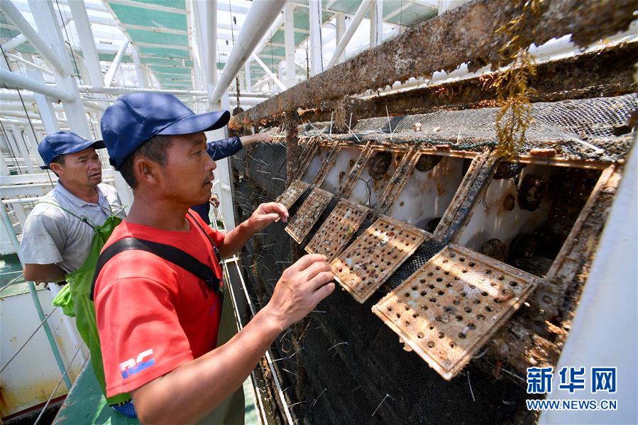 7月14日,在福建省連江縣深遠(yuǎn)海養(yǎng)殖平臺(tái)“福鮑一號(hào)”上,工人在查看鮑魚長勢(shì)。新華社記者 姜克紅 攝