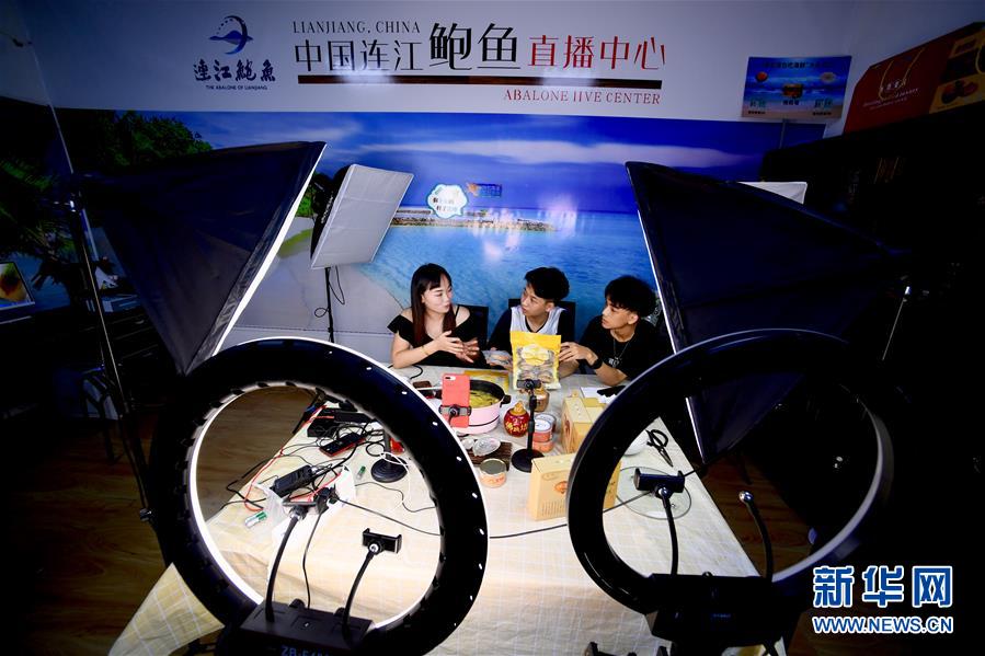 7月14日,在福建省連江縣鮑魚產品直播中心,工作人員在網上直播銷售鮑魚產品。新華社記者 姜克紅 攝