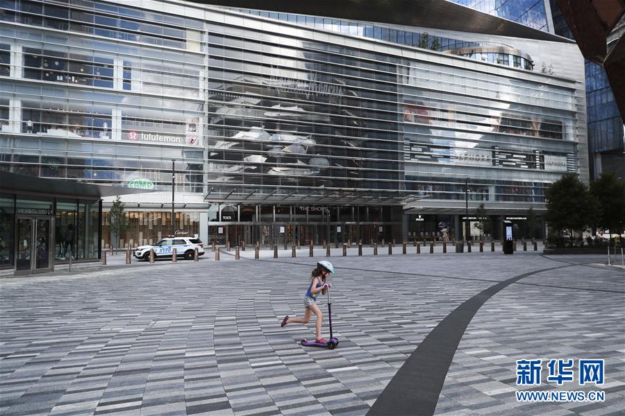 7月14日,在美國紐約一家尚未恢復(fù)店內(nèi)購物的購物中心外,一名女孩在空曠的廣場上玩耍。美國約翰斯·霍普金斯大學:截至北京時間15日6時34分,全球新冠確診病例達13258016例,死亡病例為576752例。美國是全球疫情最嚴重的國家,確診病例達3416222例,死亡病例為136319例。新華社記者 王迎 攝