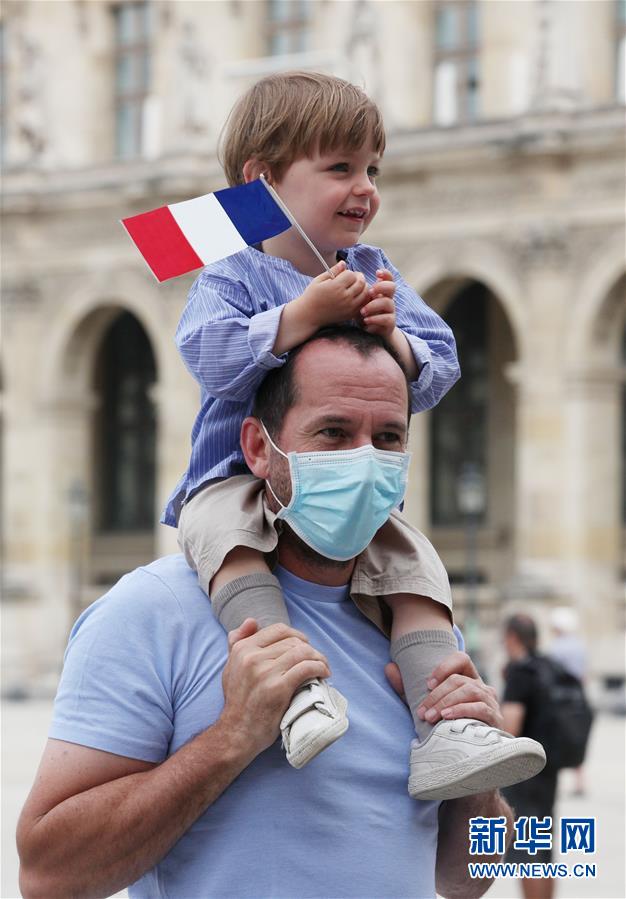 7月14日,在法國巴黎盧浮宮玻璃金字塔廣場,一對父子觀看國慶閱兵式的飛行表演。新華社記者高靜攝