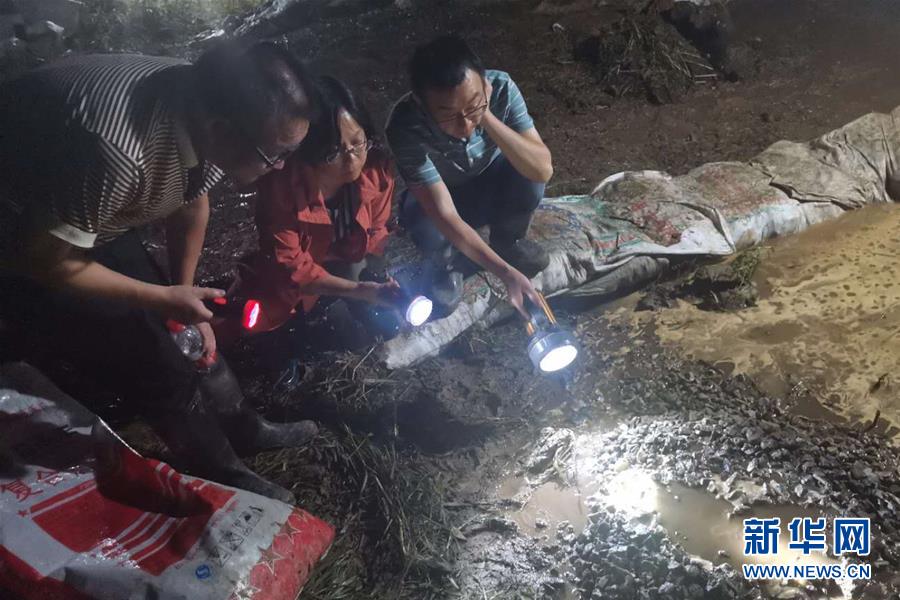7月13日晚,樅陽縣水利局高級工程師舒曉安(左一)在處置圩堤突發(fā)險情。受長江持續(xù)高水位影響,安徽省樅陽縣的鐵銅鄉(xiāng)江心洲已于近日將江心洲上的居民轉(zhuǎn)移安置,而包括搶險隊員、鄉(xiāng)鎮(zhèn)干部、水利工程師等在內(nèi)的近300人“留守”在江心洲上巡堤查險,守護(hù)家園。鐵銅鄉(xiāng)位于長江江心洲上,有4個行政村52個村民組,耕地面積12000多畝。新華社發(fā)