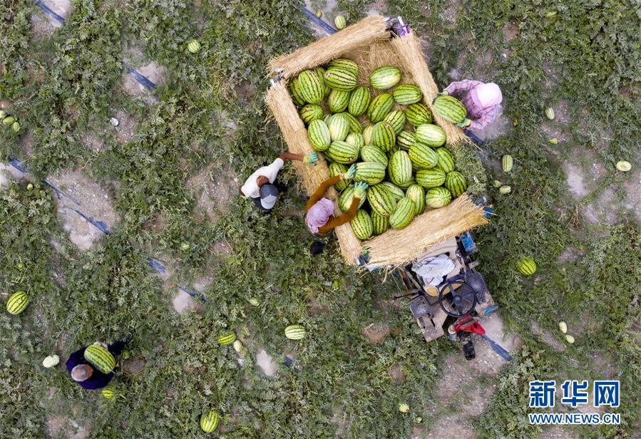 7月16日,在寧夏中衛(wèi)市香山鄉(xiāng)硒砂瓜萬畝示范基地,瓜農將采收的西瓜裝車(無人機照片)。近日,寧夏中衛(wèi)市迎來硒砂瓜豐收季。硒砂瓜是中衛(wèi)市的特色農產品,近年來,當地采取技術創(chuàng)新、規(guī)模化種植、休耕輪作等多項舉措,讓硒砂瓜種植成為當地農民增收致富的重要產業(yè)。據了解,今年中衛(wèi)市硒砂瓜種植面積為69.7萬畝。新華社記者楊植森攝
