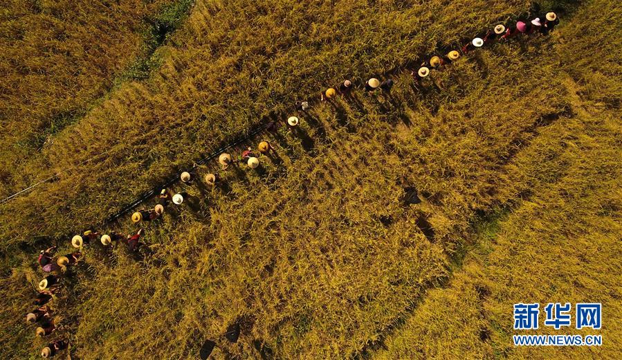 村民在海南省白沙黎族自治縣青松鄉(xiāng)擁處村的山蘭稻田內(nèi)收割山蘭稻(2019年11月17日,無人機(jī)照片)。新華社記者楊冠宇攝