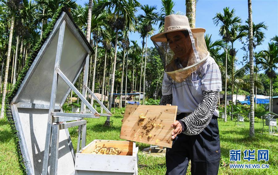 海南省瓊中黎族苗族自治縣長征鎮(zhèn)一家智慧蜂場的工作人員在查看蜂箱(2018年8月22日攝)。新華社記者楊冠宇攝