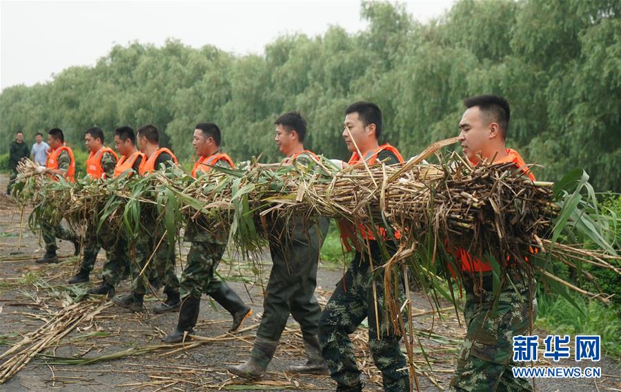 在鎮(zhèn)江市丹徒區(qū)世業(yè)鎮(zhèn)先鋒村西南大堤,中國安能集團第二工程局常州分公司防汛前置備勤隊員準(zhǔn)備將捆好的蘆葦放在江堤邊(7月17日攝)。捆蘆葦護(hù)邊坡、機器人進(jìn)涵洞、“養(yǎng)水盆”防滲漏……在江蘇鎮(zhèn)江,當(dāng)?shù)馗刹咳罕姾蛯I(yè)力量,因地制宜就地取材,老辦法搭配新技術(shù),一批險情得以消除在萌芽狀態(tài)。新華社記者季春鵬攝