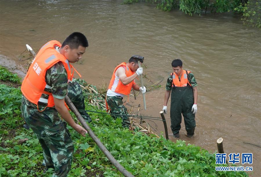 在鎮(zhèn)江市丹徒區(qū)世業(yè)鎮(zhèn)先鋒村西南大堤,中國(guó)安能集團(tuán)第二工程局常州分公司防汛前置備勤隊(duì)員在打樁,用來(lái)固定捆好的蘆葦(7月17日攝)。捆蘆葦護(hù)邊坡、機(jī)器人進(jìn)涵洞、“養(yǎng)水盆”防滲漏……在江蘇鎮(zhèn)江,當(dāng)?shù)馗刹咳罕姾蛯I(yè)力量,因地制宜就地取材,老辦法搭配新技術(shù),一批險(xiǎn)情得以消除在萌芽狀態(tài)。新華社記者季春鵬攝