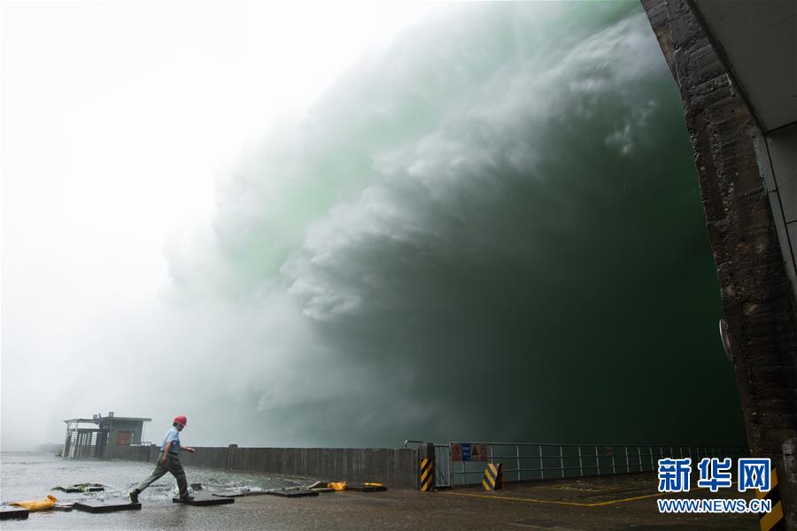 新安江電廠工作人員從正在泄洪的新安江水庫壩底經(jīng)過(7月7日攝)。新華社記者翁忻旸攝