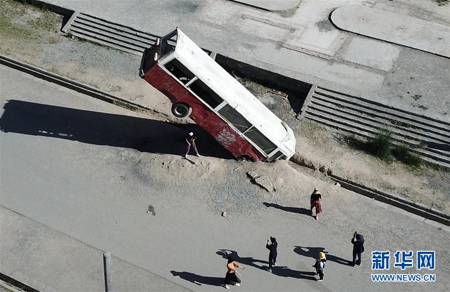 2019年8月23日,游客在阿克塞老縣城一處因拍攝電影而設(shè)置的景觀前拍照(無人機照片)。