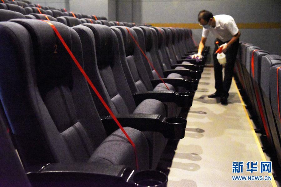 2020年7月19日,上海影城員工在放映廳里為座位消毒。當日,上海部分電影院為恢復(fù)開放營業(yè)進行最后階段準備。新華社記者任瓏攝