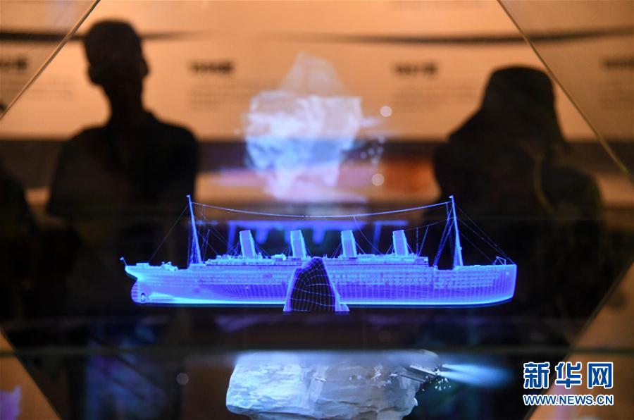 2019年8月28日,參觀者在電影博物館內(nèi)觀看“泰坦尼克號”數(shù)字模型全息演示。當日,2019青島國際影視博覽會舉行青島電影博物館探館活動。新華社記者李紫恒攝