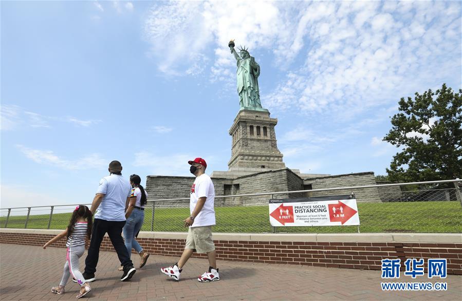 7月20日,參觀者在美國紐約自由島游覽。美國紐約市20日繼續(xù)推進經(jīng)濟重啟計劃,宣布開始進入解封新階段,進一步允許部分低風(fēng)險文娛活動重啟。自由女神像所在的自由島對公眾開放,但雕像內(nèi)部和博物館仍關(guān)閉。新華社記者王迎攝