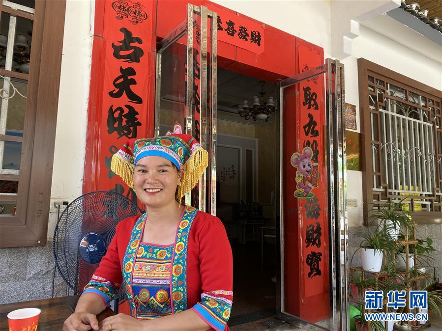 廣西恭城瑤族自治縣蓮花鎮(zhèn)紅巖村村民楊燕紅穿著民族服飾坐在家門口等待客人到來(7月16日攝)。新華社記者林凡詩攝