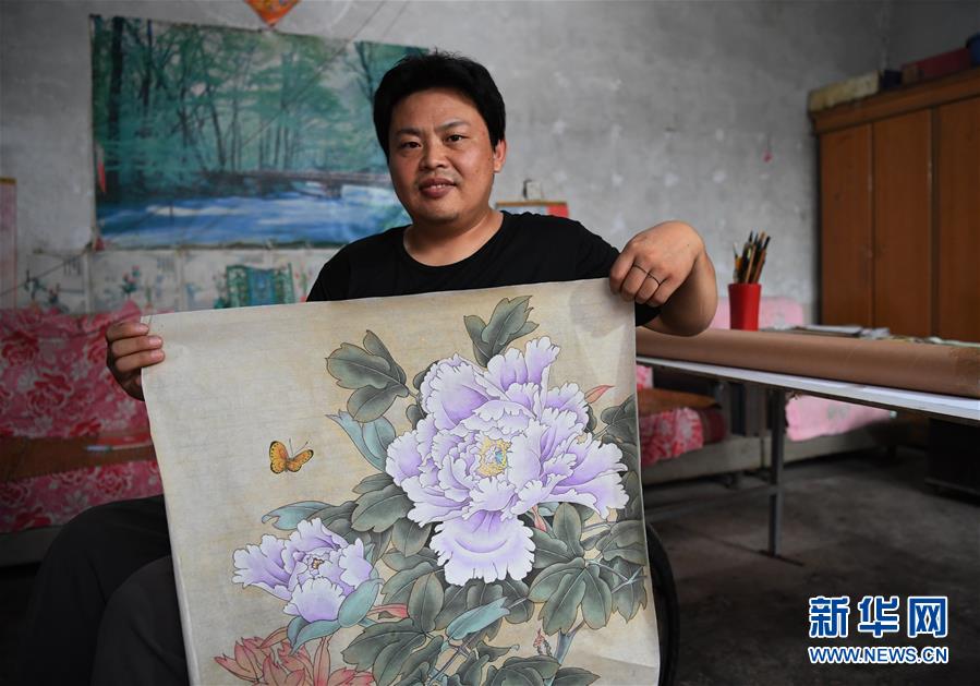 7月22日,王紅彬展示其創(chuàng)作的工筆畫作品。新華社記者朱旭東攝