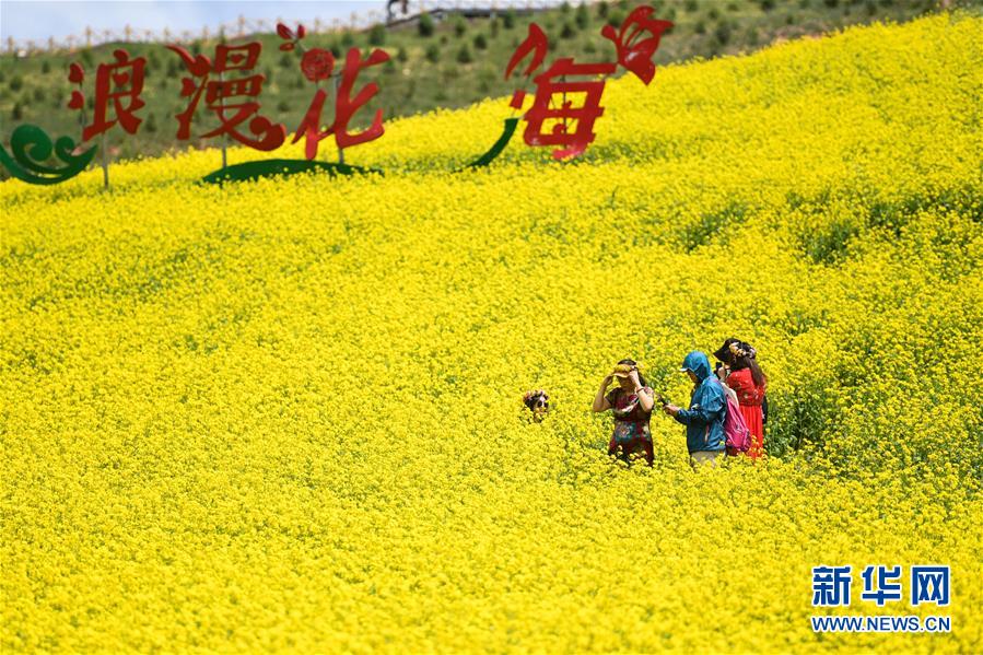 游客在門(mén)源回族自治縣的油菜花田中拍照(7月22日攝)。新華社記者 吳剛 攝