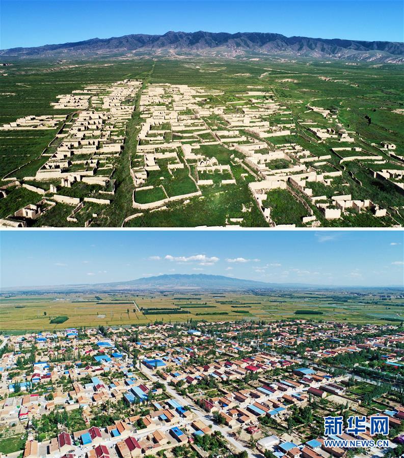 拼版照片:上圖為經(jīng)過(guò)多年的生態(tài)修復(fù),寧夏吳忠市紅寺堡區(qū)新莊集鄉(xiāng)移民舊址已逐漸被綠色覆蓋;下圖為戈壁荒灘上建起的紅寺堡移民新村(2018年9月8日攝,無(wú)人機(jī)照片)。新華社記者 王鵬 攝