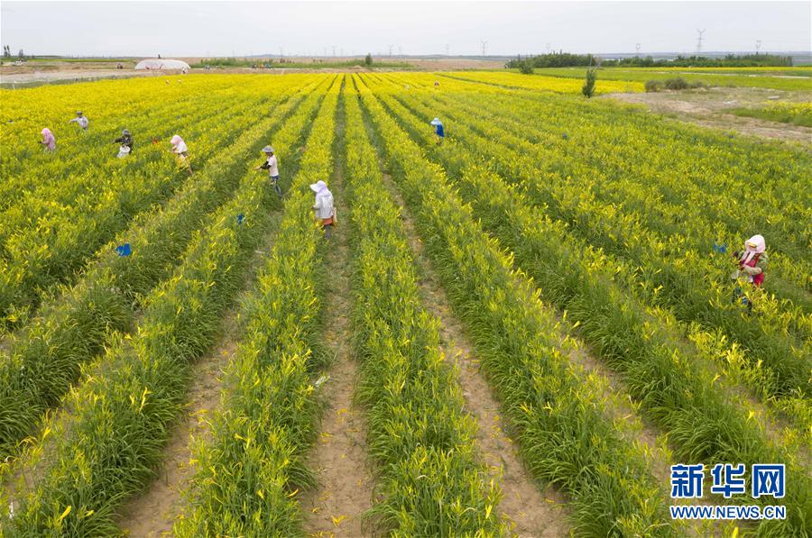 村民在寧夏紅寺堡區(qū)柳泉鄉(xiāng)柳泉村采摘黃花菜(7月11日攝,無(wú)人機(jī)照片)。新華社記者 楊植森 攝