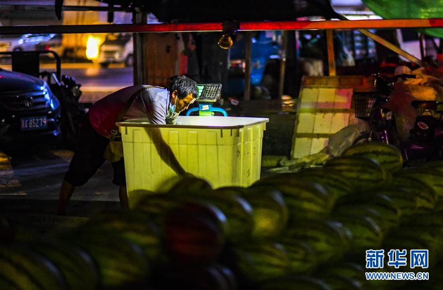 7月26日,在烏魯木齊新聯(lián)農(nóng)副產(chǎn)品綜合市場內(nèi),商販在挑選西瓜。新華社記者 趙戈 攝