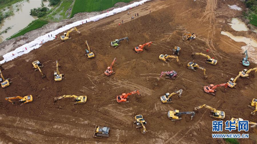 7月28日,在姜唐湖蓄洪區(qū)戴家湖一處涵閘險情處置現(xiàn)場,人們操作機(jī)械設(shè)備在搶筑臨時圩堤(無人機(jī)照片)。新華社記者張端攝