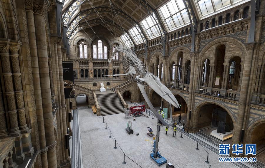 7月27日,工作人員在英國倫敦的自然歷史博物館大廳內(nèi)清潔一具藍(lán)鯨骨架。受新冠疫情影響關(guān)閉數(shù)月的英國自然歷史博物館將于8月5日重新對(duì)外開放,目前館方正在為重新開放做最后準(zhǔn)備。參觀者需要提前預(yù)約參觀時(shí)段、全程佩戴口罩且保持安全距離。新華社記者韓巖攝