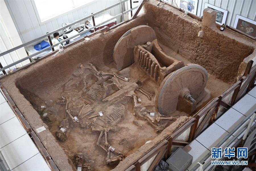 這是7月30日在陜西省考古研究院涇渭基地拍攝的西周晚期青銅輪牙馬車。經(jīng)過文物保護(hù)人員3年多連續(xù)不斷的保護(hù)修復(fù),一套總長(zhǎng)超過3米的西周晚期青銅輪牙馬車已保護(hù)和復(fù)原完畢。這套青銅輪牙馬車2014年出土于陜西省寶雞市岐山縣周原遺址,馬車長(zhǎng)3.13米、寬2.7米、高1.5米,車頭部位有4匹馬的遺骸。馬車車廂裝飾華麗繁復(fù),有大量鑲嵌綠松石的青銅構(gòu)件、薄壁青銅獸面裝飾以及玉器和彩繪構(gòu)件,車輪外沿全部由青銅鑄造而成,這也是目前唯一一套部件完整的青銅輪牙馬車。根據(jù)實(shí)驗(yàn)室提取的遺物和精確數(shù)據(jù),考古工作者按照原來的工藝、結(jié)構(gòu)對(duì)這輛青銅輪牙馬車進(jìn)行了同比例復(fù)原。這套青銅輪牙馬車的保護(hù)和復(fù)原,對(duì)研究西周晚期的禮儀及車輿制度有重要價(jià)值。新華社記者李一博攝