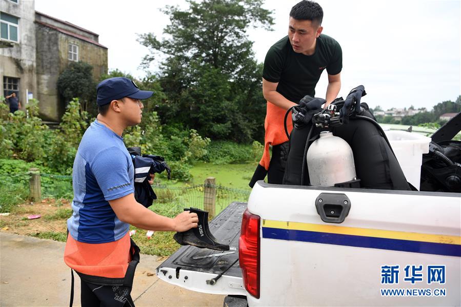7月24日,徐宏林(左)和吳正寶在安徽省廬江縣臺(tái)創(chuàng)園小南河段準(zhǔn)備潛水裝備。新華社記者劉軍喜攝