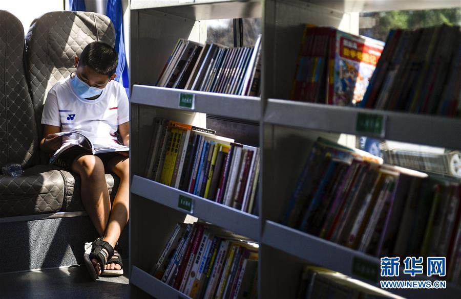 8月5日,一名小讀者在“流動圖書館”里看書。三千冊圖書,一輛大巴車,穿梭在城市的街頭巷尾。在吉林長春,長春市圖書館利用流動圖書車,定期在市內(nèi)15個固定服務(wù)點(diǎn)間巡回流動,為市民提供便捷的圖書借閱服務(wù)。新華社記者許暢攝