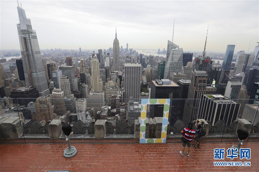 8月6日,在美國(guó)紐約,人們?cè)诼蹇朔评罩行挠^景臺(tái)上觀看城市景觀。當(dāng)日,3月份暫時(shí)關(guān)閉的洛克菲勒中心觀景臺(tái)恢復(fù)對(duì)公眾開(kāi)放。每天13時(shí)至21時(shí),人們可戴口罩前往參觀。新華社記者王迎攝