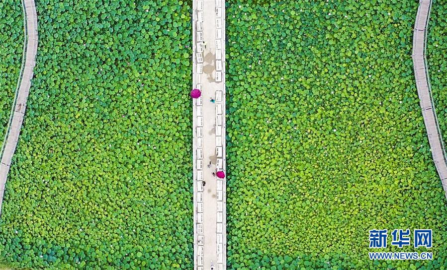8月6日,游客在河北省永清縣里瀾城鎮(zhèn)金華湖觀賞荷花(無人機照片)。夏日時節(jié),河北省永清縣里瀾城鎮(zhèn)金華湖荷塘的荷花爭相開放,吸引市民和游客前來游玩觀賞。新華社記者李曉果攝