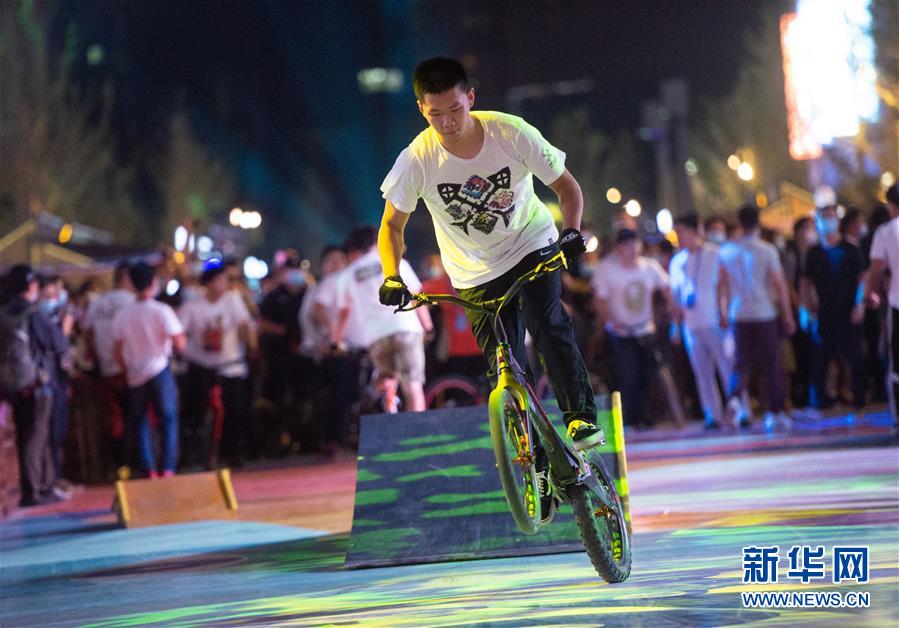 8月8日晚,自行車(chē)特技表演在望京小街商業(yè)街上演。新華社記者 陳鐘昊 攝
