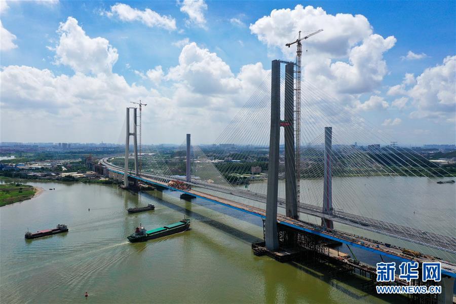 8月9日拍攝的廣州南沙港鐵路跨西江特大斜拉橋最后一塊鋼箱梁吊裝施工現(xiàn)場(無人機照片)。當日,中鐵十一局承建的粵港澳大灣區(qū)基礎設施“硬聯(lián)通”重點工程——廣州南沙港鐵路跨西江特大斜拉橋完成最后一塊鋼箱梁吊裝作業(yè),大橋即將合龍。該橋位于廣東佛山市和江門市交界處,全長1117.5米。新華社記者劉大偉攝。