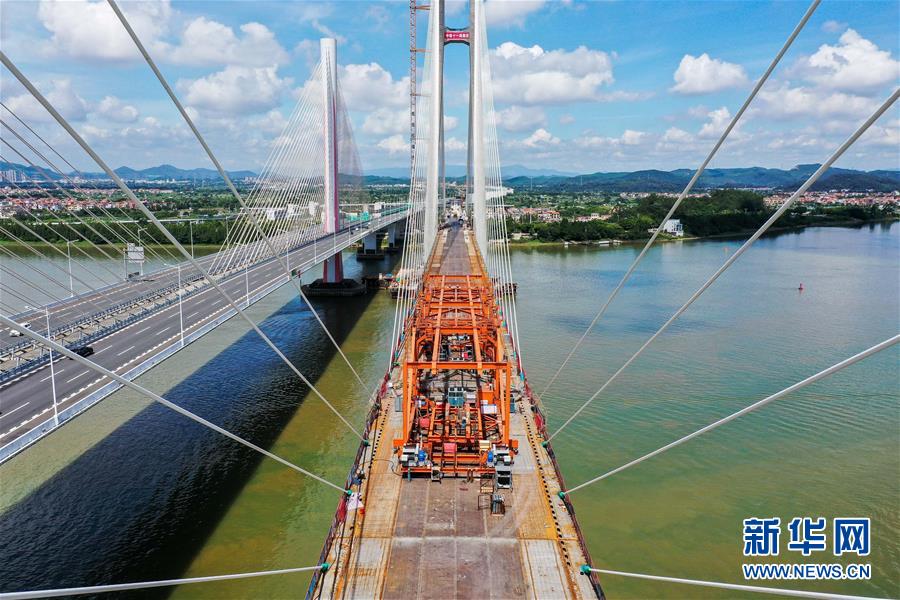 8月9日拍攝的廣州南沙港鐵路跨西江特大斜拉橋最后一塊鋼箱梁吊裝施工現(xiàn)場(chǎng)(無(wú)人機(jī)照片)。當(dāng)日,中鐵十一局承建的粵港澳大灣區(qū)基礎(chǔ)設(shè)施“硬聯(lián)通”重點(diǎn)工程——廣州南沙港鐵路跨西江特大斜拉橋完成最后一塊鋼箱梁吊裝作業(yè),大橋即將合龍。該橋位于廣東佛山市和江門(mén)市交界處,全長(zhǎng)1117.5米。新華社記者劉大偉攝。