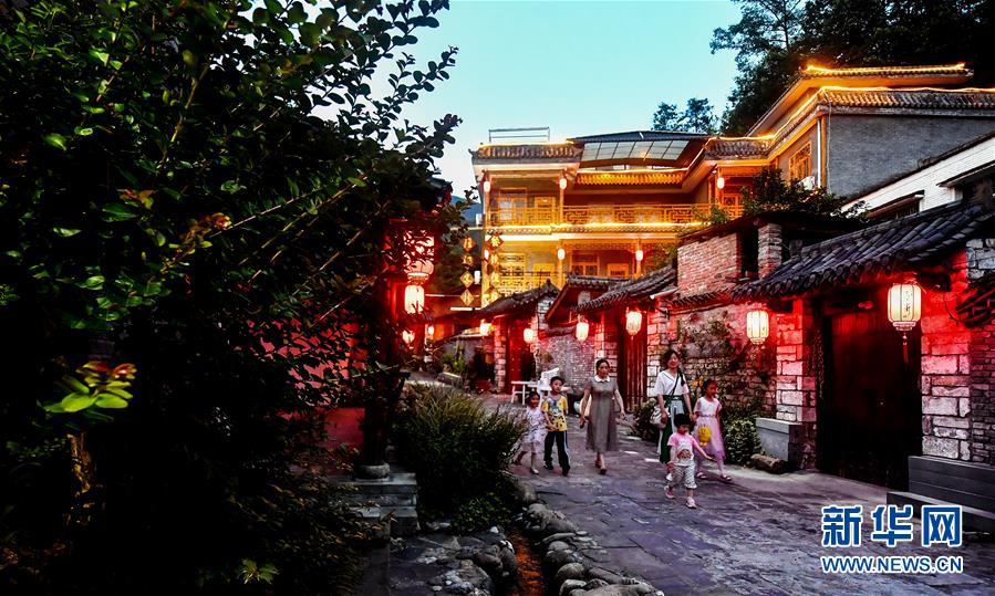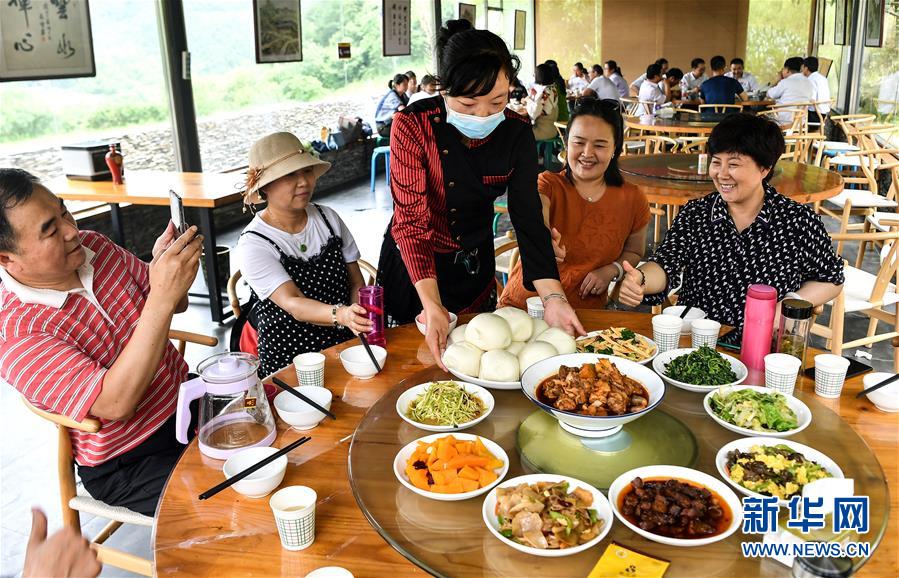 游客在陜西寶雞市太白縣咀頭鎮(zhèn)白云村的一家農(nóng)家樂里就餐(7月5日攝)。白云村是秦嶺深處的小山村,2016年建檔立卡貧困戶303人。近年來,為了徹底改變貧困面貌,白云村依靠當(dāng)?shù)匾郎桨牡赜騼?yōu)勢,全面提升人居環(huán)境和村容村貌,發(fā)展鄉(xiāng)村旅游,讓群眾持續(xù)增收。目前,白云村已實(shí)現(xiàn)整體脫貧,2019年全村人均純收入12880元。新華社記者劉瀟攝。