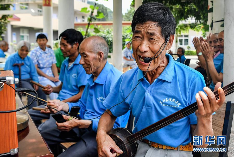 陜西商洛市洛南縣靈口區(qū)域敬老院的老人們在唱靜板書(7月28日攝)。據(jù)了解,陜西洛南縣目前共有9所敬老院,設(shè)置床位760張,對全縣愿意到敬老院的381名農(nóng)村特困人員實(shí)行集中供養(yǎng)政策。新華社記者劉瀟攝。