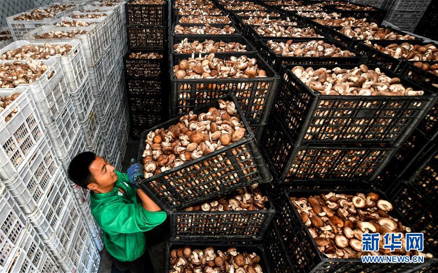 陜西漢中市留壩縣武官驛鎮(zhèn)留香益品商貿(mào)公司的員工在擺放冷庫里的香菇(7月2日攝)。陜西留壩縣是陜西西南部的特色農(nóng)業(yè)產(chǎn)業(yè)縣,近年來在推進(jìn)產(chǎn)業(yè)富民的過程中,開辟出一條“政府+龍頭企業(yè)+扶貧社+農(nóng)戶”的訂單產(chǎn)業(yè)發(fā)展道路,把農(nóng)戶綁在產(chǎn)業(yè)鏈上,持續(xù)帶動農(nóng)業(yè)增效、農(nóng)民增收。新華社記者劉瀟攝。