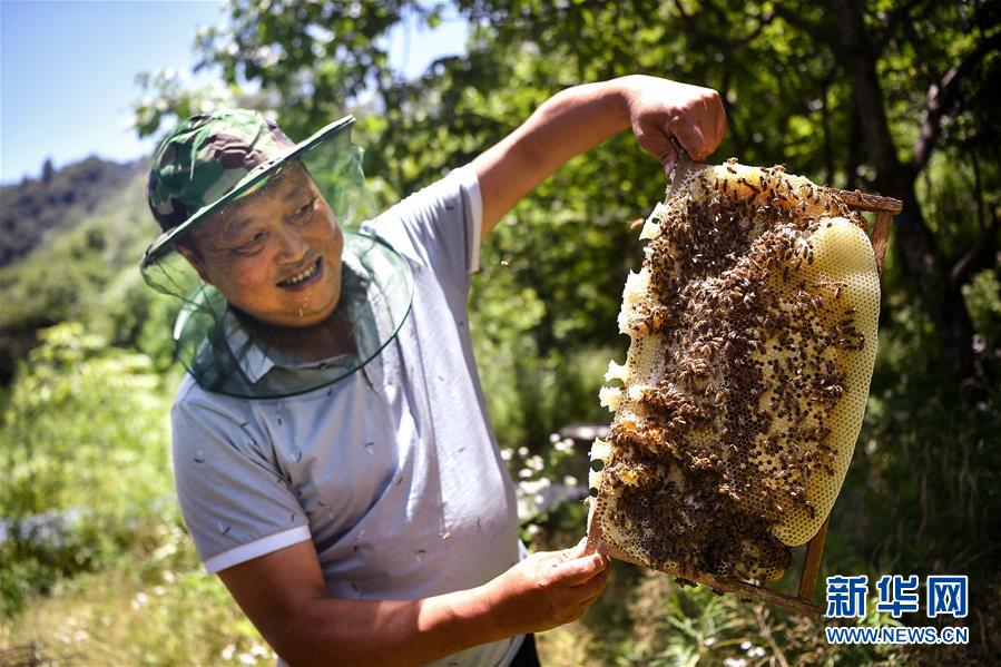 陜西漢中市留壩縣火燒店鎮(zhèn)天星亮村村民在展示扶貧社養(yǎng)殖的蜜蜂(7月2日攝)。秦嶺生態(tài)資源豐富,具有得天獨厚的蜜蜂養(yǎng)殖條件,但多年來山區(qū)農(nóng)戶自產(chǎn)自銷的模式收益甚少。近年來,多地采取“農(nóng)戶+合作社”模式,讓山區(qū)群眾養(yǎng)蜂增收有了保障。新華社記者劉瀟攝。