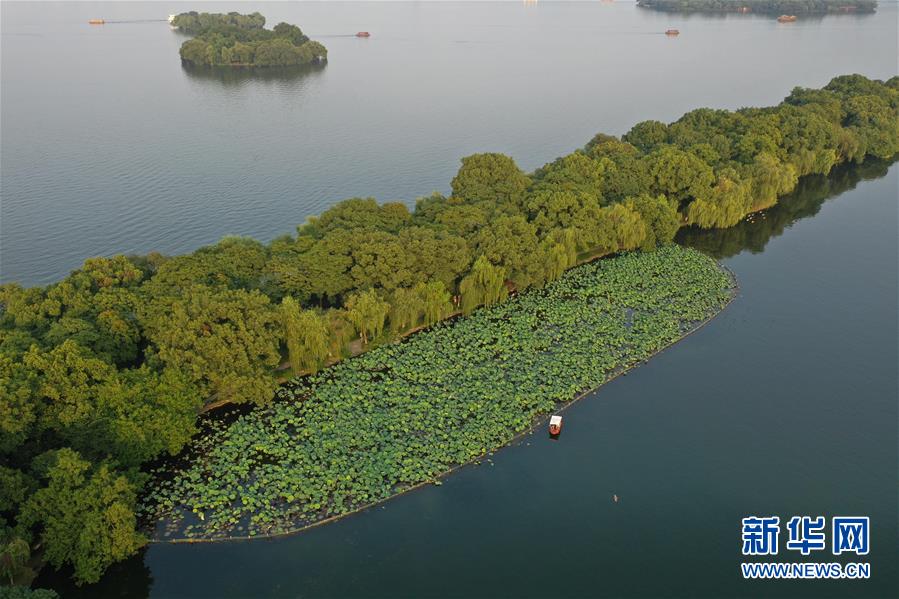 游客在西湖景區(qū)蘇堤附近觀賞荷花(6月30日攝,無(wú)人機(jī)照片)。新華社記者黃宗治攝。