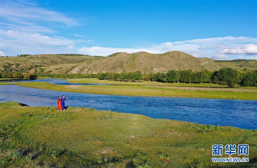 在內(nèi)蒙古自治區(qū)鄂溫克族自治旗伊敏蘇木,艾吉瑪(左)和母親烏仁在伊敏河邊散步(8月6日攝,無人機(jī)照片)。新華社記者徐欽攝。