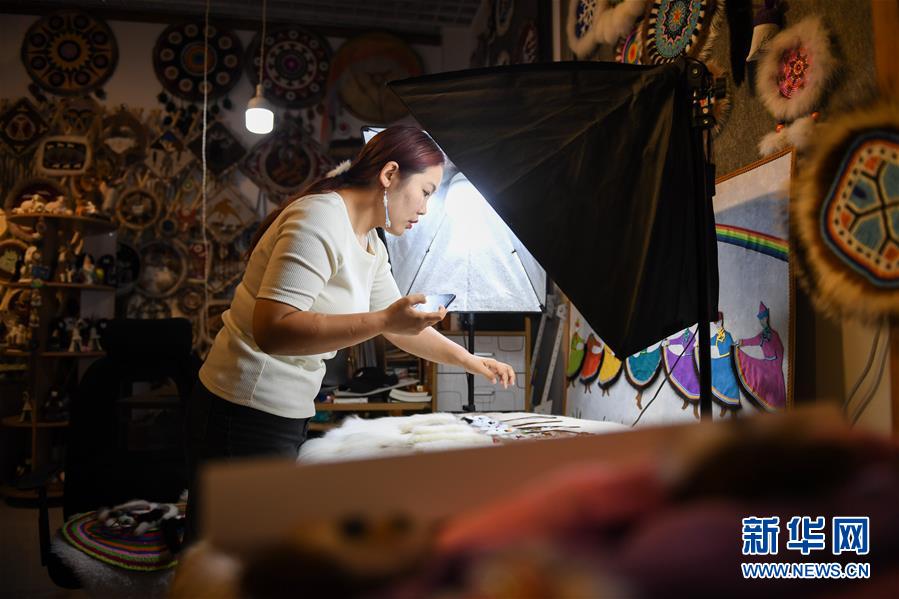 在內(nèi)蒙古自治區(qū)鄂溫克族自治旗巴彥托海鎮(zhèn)太陽(yáng)花傳承發(fā)展中心,艾吉瑪在拍攝手工藝品照片(8月7日攝)。新華社記者劉磊攝。