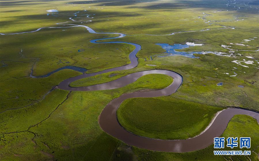 俯瞰泥拉壩濕地里彎曲的河流,該濕地泥炭富集、水系發(fā)達(dá)(8月9日攝,無(wú)人機(jī)照片)。新華社記者江宏景攝。