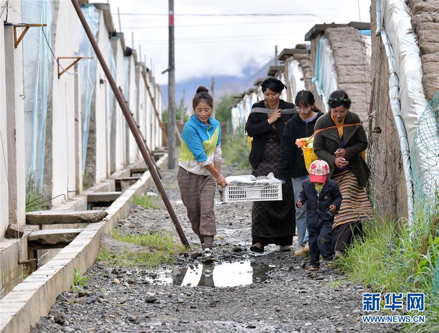 格桑旺姆(左三)和姐姐德吉卓瑪(左一)帶領雇傭的殘障村民巴珍(右一)搬運大棚出產的新鮮蔬菜(8月3日攝)。新華社記者 李賀 攝