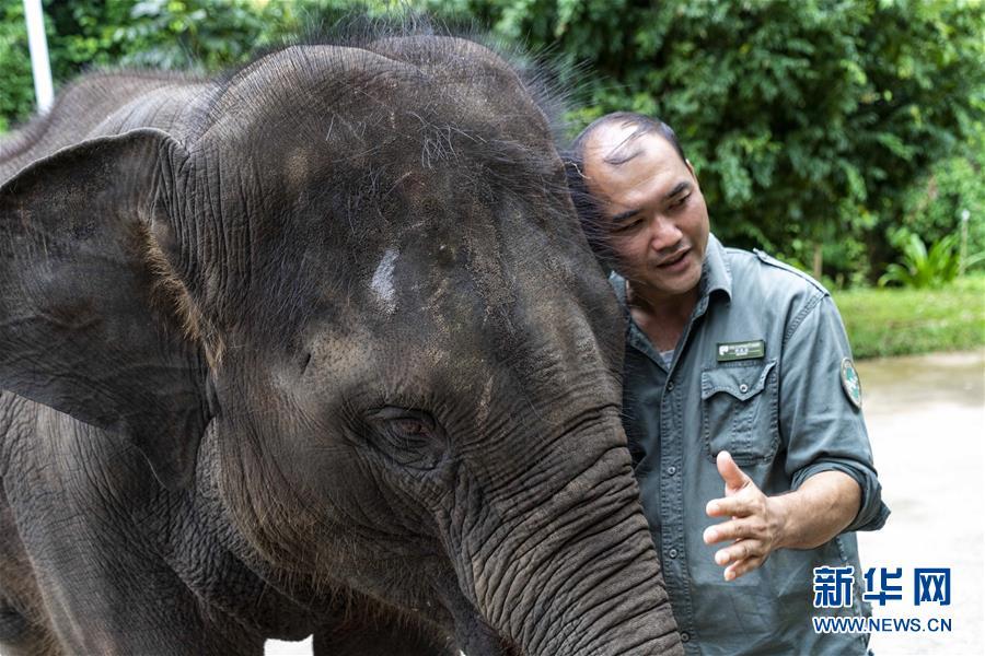 8月12日,在西雙版納傣族自治州亞洲象種源繁育及救助中心,一名“象爸爸”在和救助象“羊妞”互動(dòng)。新華社記者 陳欣波 攝