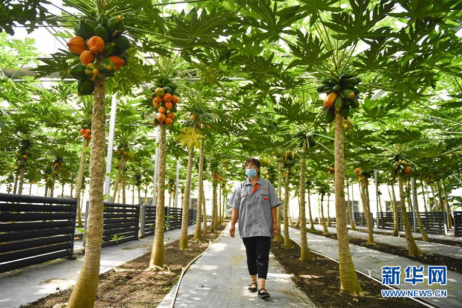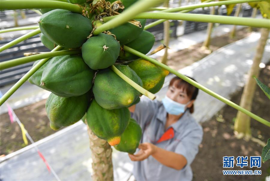 在吉林省永吉縣萬(wàn)昌鎮(zhèn)宇豐紅果木瓜產(chǎn)業(yè)園,工作人員在大棚內(nèi)管護(hù)木瓜(8月12日攝)。新華社記者 許暢 攝